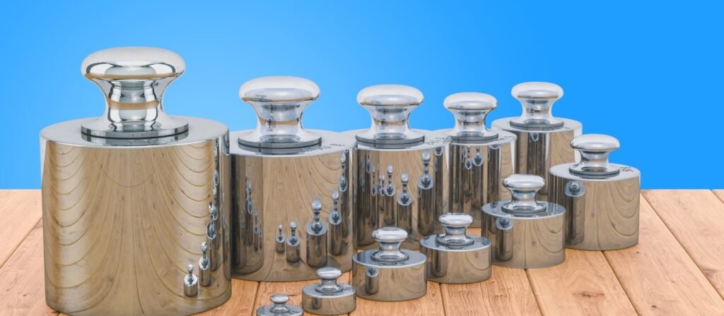 Os pesos mais comuns para calibração de balanças analíticas variam de 1 g até 200 g, sendo ideal utilizar o peso que mais se aproxima da capacidade total do equipamento, sem ultrapassá-la.