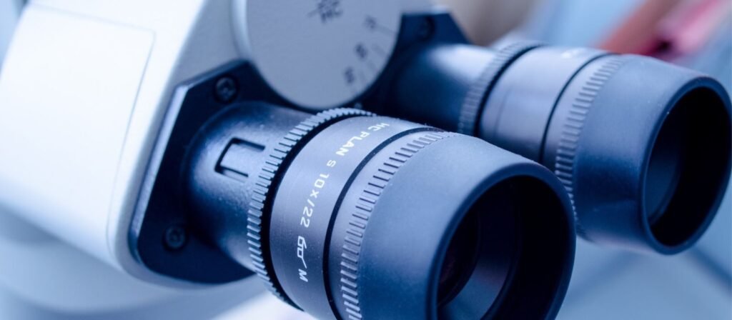 O modelo de microscópio de laboratório  com duas oculares é chamado de microscópio binocular.