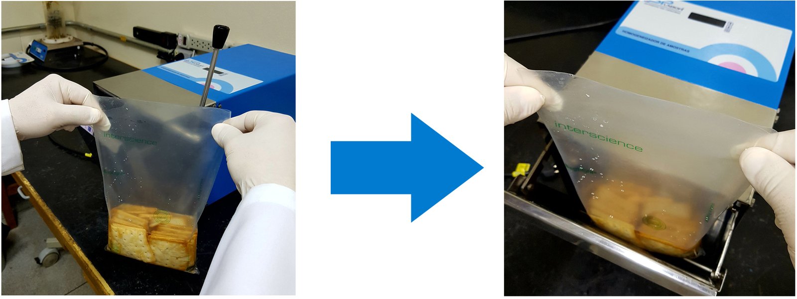 Com o início do processo, pás gêmeas do Stomacher agem sobre o saco com movimentos constantes, ocasionando o esmagamento, a lavagem e a circulação da amostra no interior da bolsa plástica.