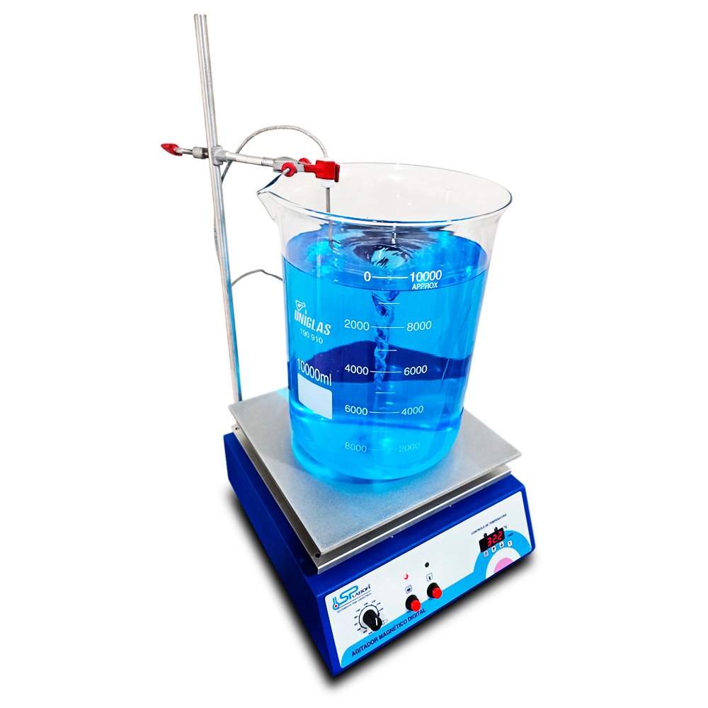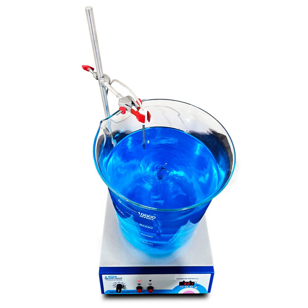 Serve para aquecer e agitar simultaneamente soluções líquidas, garantindo homogeneidade e controle térmico em análises laboratoriais.
