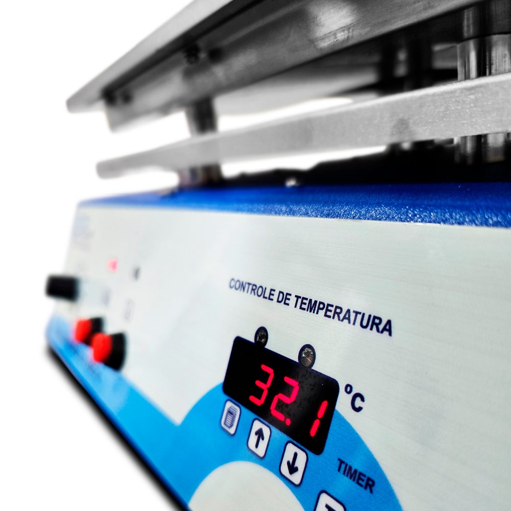 • Display Digital: Possui um display digital que exibe com precisão tanto a velocidade de agitação quanto a temperatura, facilitando o monitoramento em tempo real.