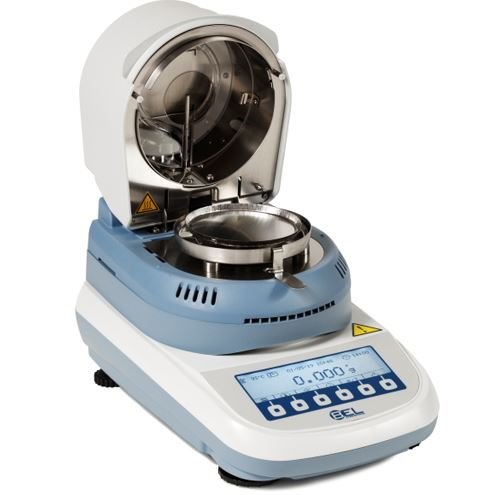 O equipamento mede a perda de massa da amostra durante o aquecimento, calculando automaticamente o percentual de umidade residual.