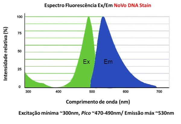 - O NoVo DNA stain é especificamente formulado para ser uma excelente alternativa menos perigosa para o Brometo de Etídio (EtBr), as bandas de DNA podem ser detectadas utilizando luz azul ou excitação ultravioleta (UV) (Figura 1), evitando danos à saúde. Com excitação máxima (EM) aproximadamente a 300nm, sendo o pico entre 470-490nm.