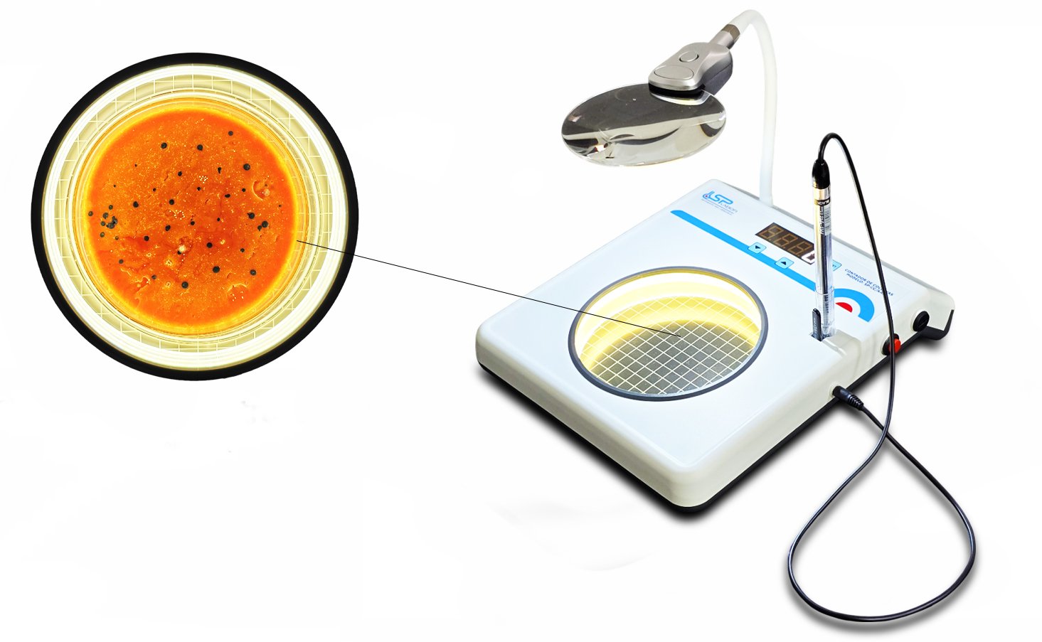 • O contador de colônias é um instrumento digital de teste bacteriano com visor.
