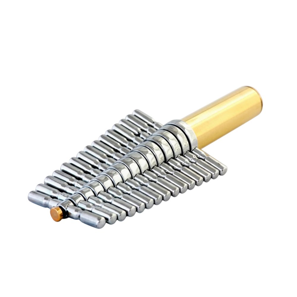 Fabricado em tubos de latão polido de diferentes diâmetros, o furador de rolhas oferece resistência mecânica, durabilidade e excelente desempenho de corte. O conjunto permite a perfuração limpa e uniforme da rolha, reduzindo o risco de fissuras ou deformações que poderiam comprometer a vedação do sistema.