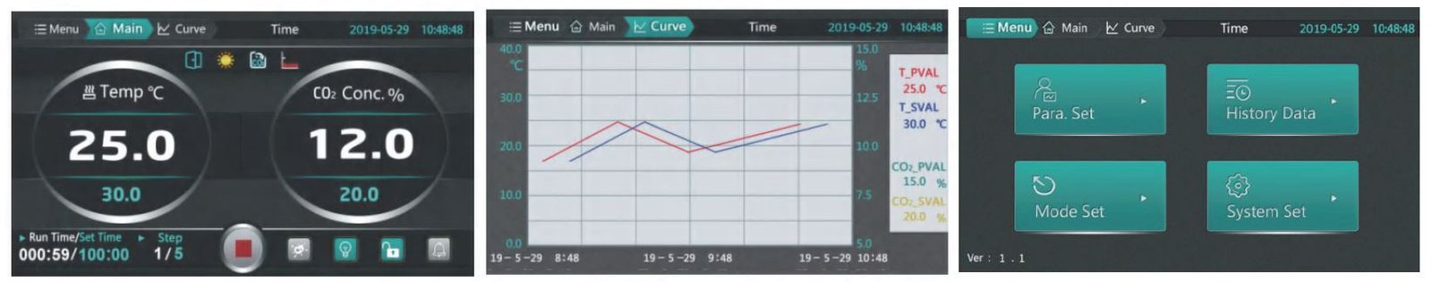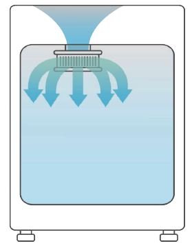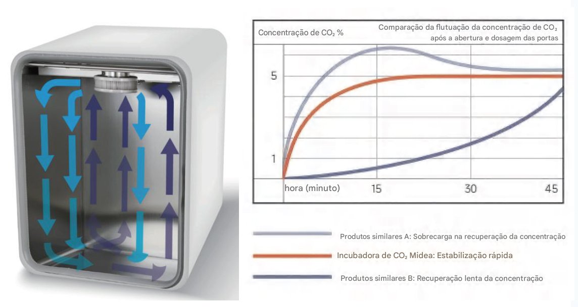 A incubadora conta com um sistema de circulação de ar assistido por ventilador, que permite rápida recuperação do ambiente. O padrão de fluxo de ar foi projetado para garantir a distribuição uniforme dos principais parâmetros — incluindo temperatura, concentração de gases e umidade — em toda a câmara.