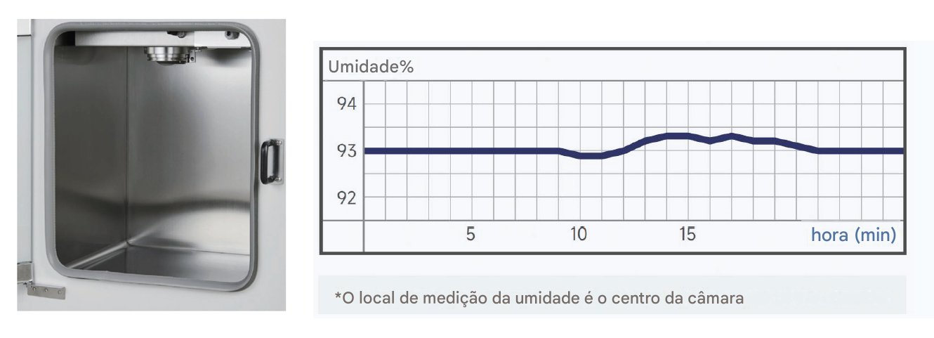 Esse desempenho é sustentado pela manutenção estável da umidade, conforme demonstrado no gráfico correspondente, onde a umidade relativa atinge consistentemente 93–94% com mínima variação. A ventilação sem turbulência em toda a câmara contribui ainda mais para um ambiente de cultura constante e uniforme.