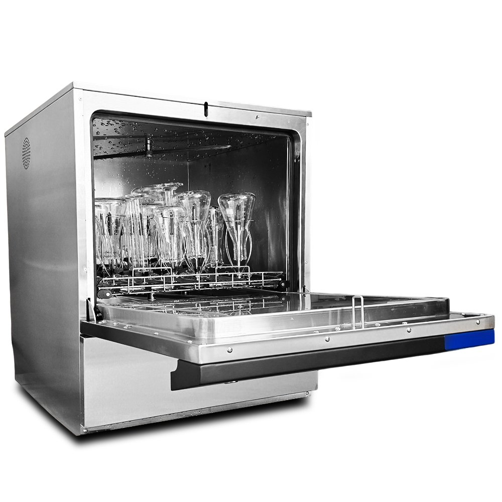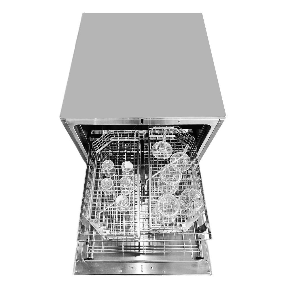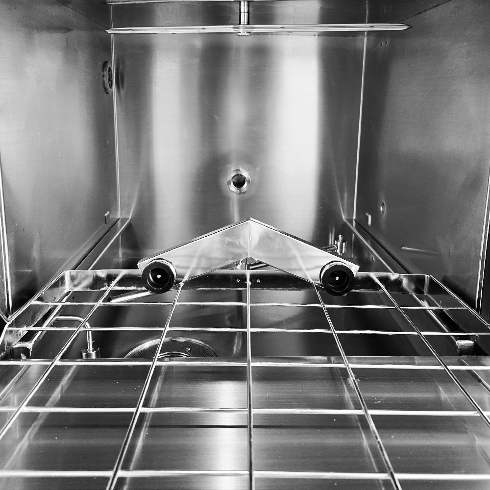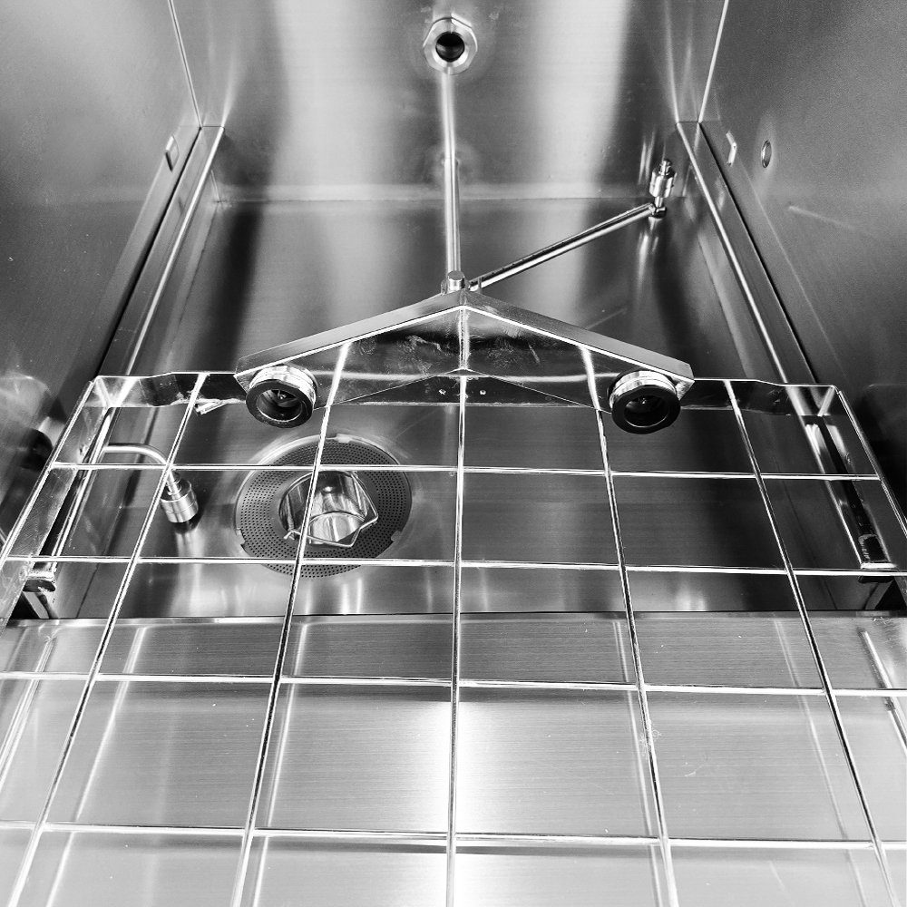 - Duas entradas de água paralelas na parte traseira garantem uma distribuição uniforme da pressão para cada prateleira e cada bico de pulverização.