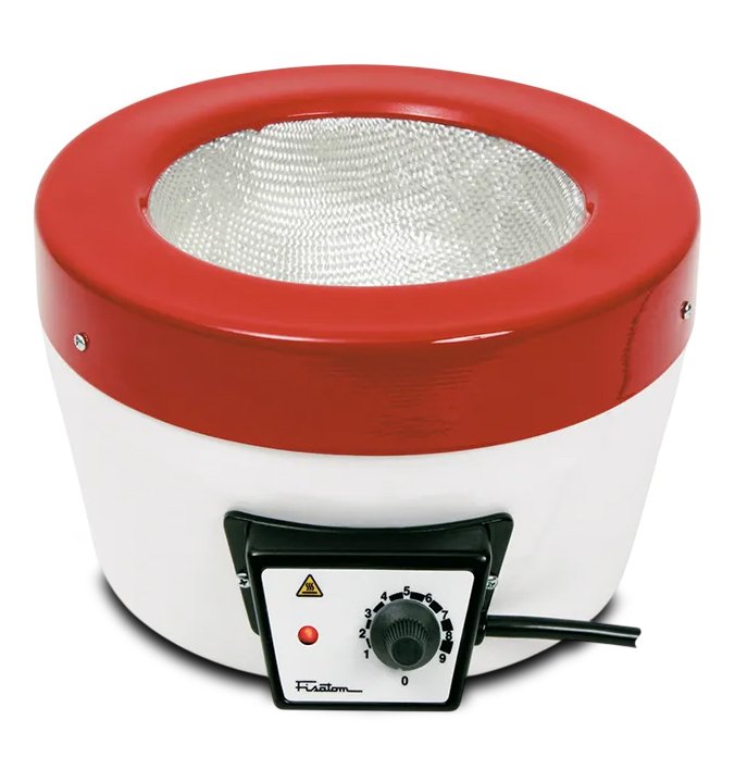 • Corpo de alumínio, acabamento em epóxi, conjunto de aquecimento de fácil substituição (equipamento não descartável) em fibra de vidro e resistência de níquel cromo, para utilização com balões de fundo redondo e temperatura máxima de utilização 300°C, com regulador de potência eletrônico, atuando por impulso com tempo regulável, indicado por lâmpada piloto.
