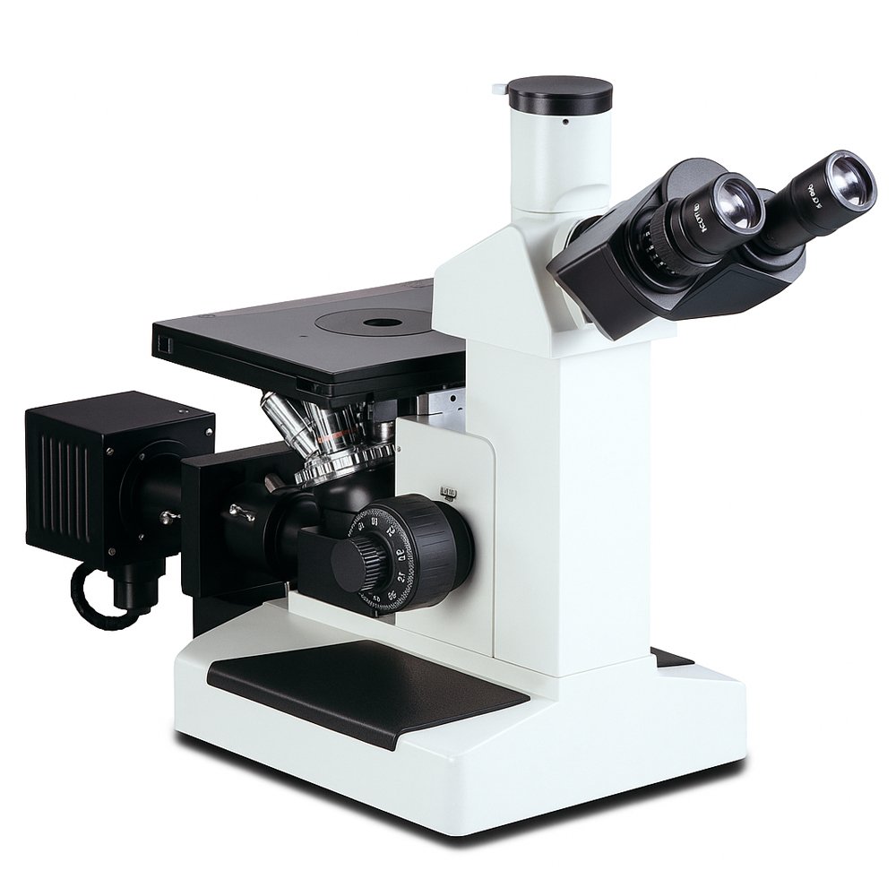 É um microscópio utilizado para analisar superfícies metálicas, ligas e microestruturas, com o sistema óptico invertido que permite observar amostras polidas sem cortes.