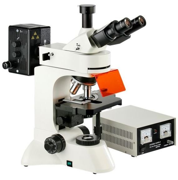 | Microscópio Trinocular com Fluorescência – Objetivas Planacromáticas 4X/10X/40X/100X – Aumento até 1000X |