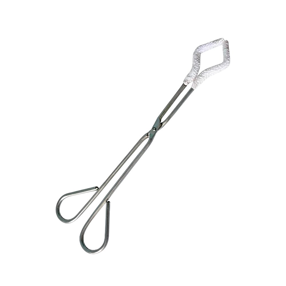 A pinça é fabricada em estrutura metálica resistente, projetada para suportar uso contínuo em ambientes laboratoriais. Suas pontas são revestidas com amianto, material tradicionalmente utilizado por sua elevada resistência térmica e capacidade de isolamento, permitindo o contato seguro com vidrarias aquecidas.