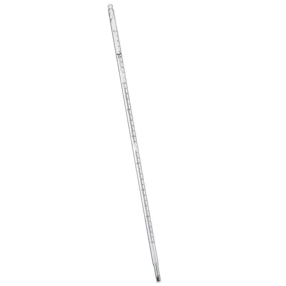 Termômetro Decimal, escala interna, capilar transparente, enchimento a Mercúrio (Hg), diâmetro dec8,5-9,5 mm, fechamento Richter com botão. Escala: -10+50:0,1°C Divisão: 0,1°C Comprimento: 470±5 Imersão: Total Limite de erro: ±0,2