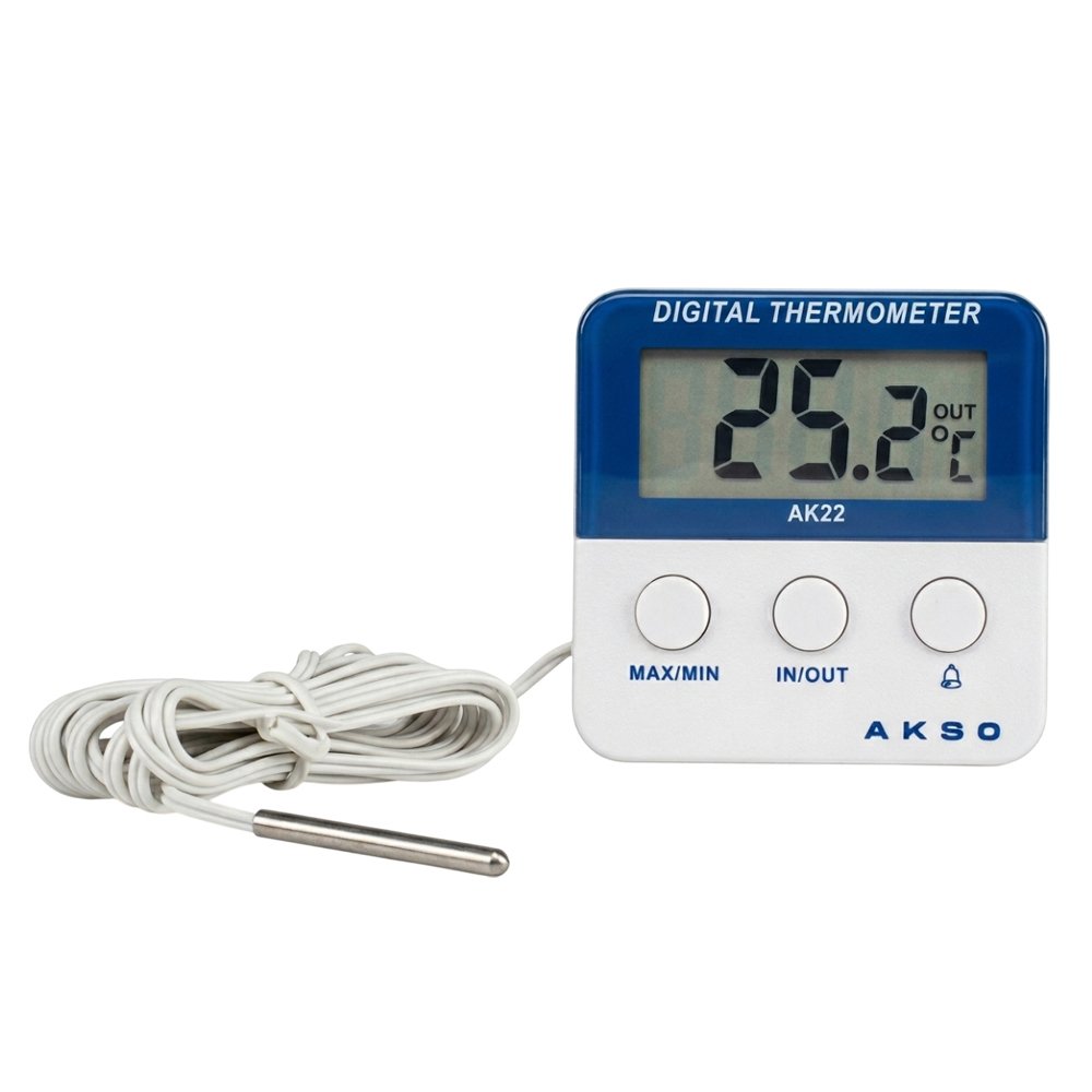 O Termômetro Digital AK22 possui **dupla leitura de temperatura**, permitindo o monitoramento simultâneo da temperatura ambiente e da temperatura interna por meio de **sonda externa**. Seu visor LCD amplo proporciona leitura clara e rápida, sem a necessidade de abrir o equipamento refrigerado, contribuindo para a manutenção da temperatura interna.