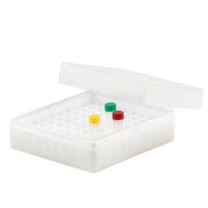 Tampa destacável (sem dobradiça). Identificação numérica. Feita em polipropileno PP rígido, autoclavável. Resistente a temperatura -186ºC à + 121ºC.